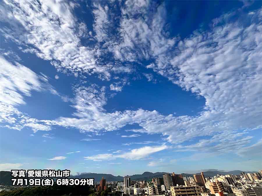 太平洋高気圧が北への張り出しを強めたことで梅雨前線が北に離れ、今日の四国は晴れているところが多くなっています。高知県内などは湿った空気の影響を受けて雲が多いものの、晴れている所もあります。