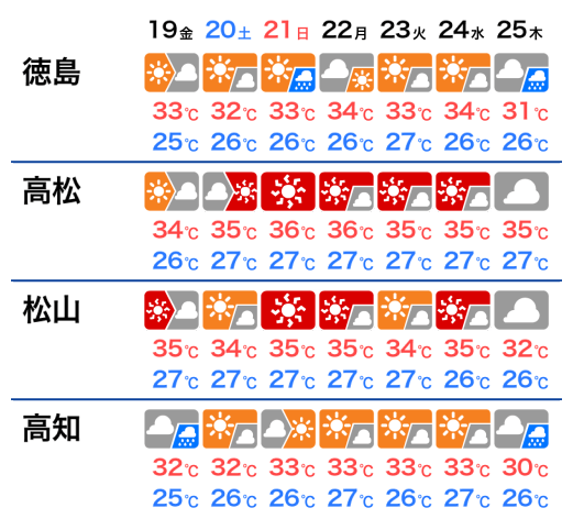 四国では、この先も太平洋高気圧に覆われて晴れる日が多くなります。湿った空気の影響でにわか雨の可能性はありますが、梅雨前線の影響を受ける日は予想されていません。