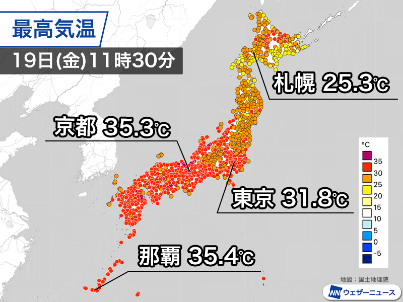 関東は昨日に比べると雲が多い分だけ気温の上がり方が鈍く、東京都心の最高気温は31.8℃に留まっています。天気が崩れ厚い雲が広がっている北日本も昨日よりも気温の低い所が多く、札幌市は25.3℃です。