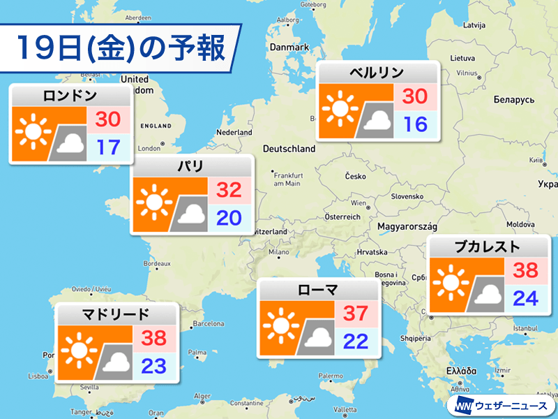 現地時間の19日(金)は暖気が北に拡大し、フランスの北部やイギリスなどの気温が上昇します。最高気温はパリで32℃、ロンドンで30℃まで上がる予想です。