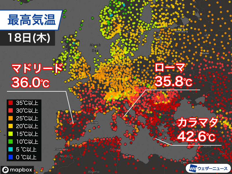 上空1500mで+21℃以上の晴れれば35℃に到達するような暖気がヨーロッパの南半分ほどを覆っていて、現地時間18日(木)の最高気温はイタリアのローマやスペインのマドリードで36℃まで上昇。フランスでも地中海に面した南部では35℃以上の暑さになっている所があります。