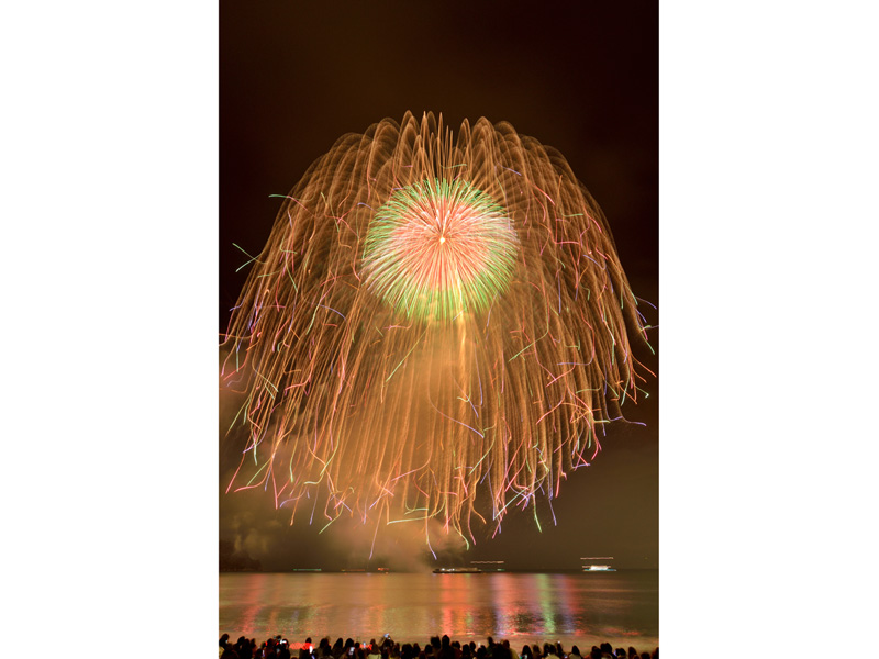 「花火の楽しみ方には、それぞれ好みもあると思いますので一概にはいえませんが、一般的に尺玉(10号玉/直径・高さ約300m)が上がるような大きな花火大会の場合は、500〜600mぐらいが打ち上がりから花火の全体像が確認できるベストの距離といえます。