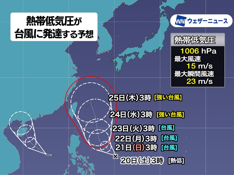 フィリピンの東の熱帯低気圧は、今後勢力を強めて台風に発達する可能性が高くなってきました。その後も発達し、2日先の22日(月)頃になると暴風域を伴う勢力に発達、3日先の23日(火)頃になると強い勢力に発達することが予想されています。