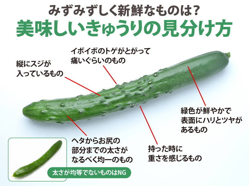 それよりも、ヘタからお尻の部分までの太さがなるべく均一のものを選びましょう。曲がったきゅうりも同様です。曲りながらも全体が同じ太さのものは美味しいきゅうりの目安です。