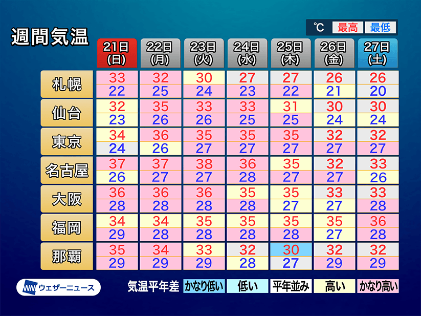 夏の太平洋高気圧に覆われる東日本や西日本では、ほとんどの都市で最高気温が30℃以上の真夏日が続き、35℃以上の猛暑日が連日予想されている所もあります。