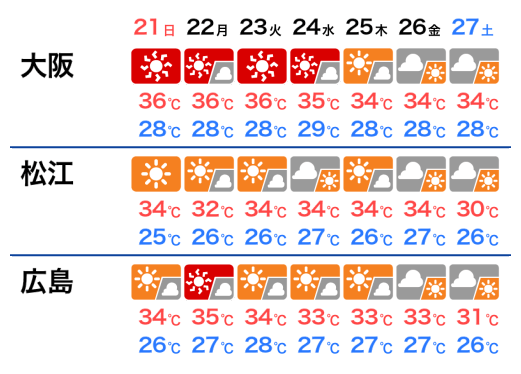 近畿・中国地方では、この先も太平洋高気圧に覆われて晴れる日が多くなります。湿った空気の影響でにわか雨の可能性はありますが、梅雨前線の影響を受ける日は予想されていません。