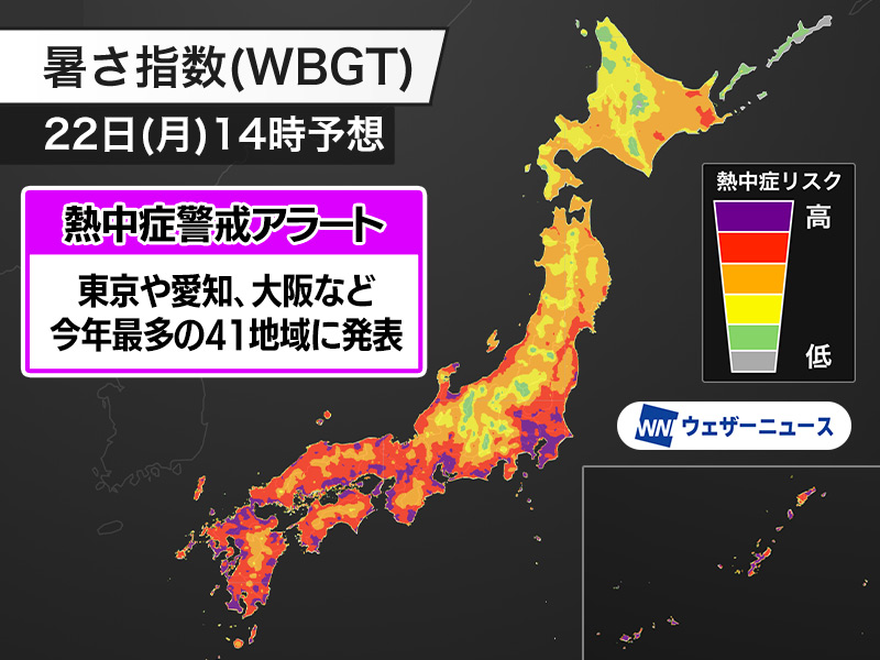 環境省と気象庁は、今日22日(月)を対象とした熱中症警戒アラートを東北南部から沖縄にかけて今年最多の41地域に発表しました。