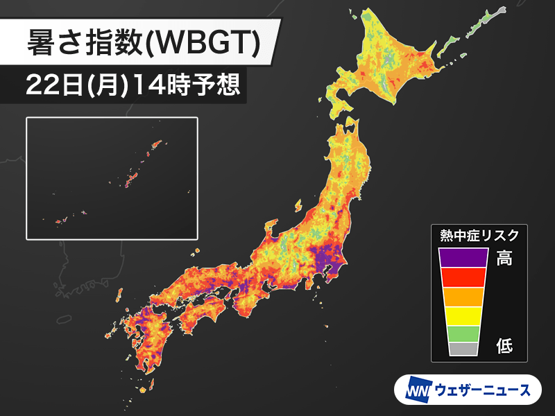午後も各地で暑さが続く見込みです。暑さ指数(WBGT)は非常に高く、熱中症になりやすい気象状況となります。