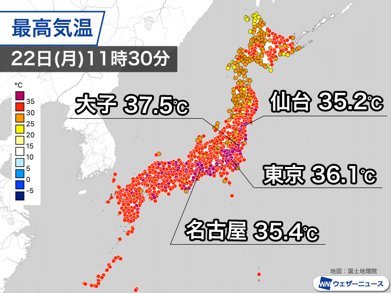 11時30分までの最高気温が全国で最も高いのは茨城県大子町で37.5℃まで上昇。そのほか、静岡県浜松市・天竜で37.4℃、前橋市で36.9℃、名古屋市で35.4℃など関東、東海で猛暑日の所が目立ち、東京都心も36.1℃で今年一番の暑さになりました。