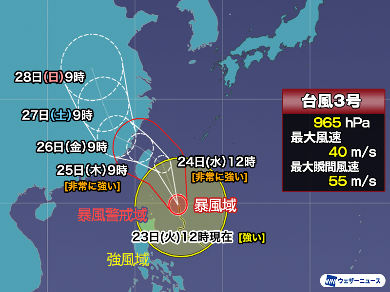 台風3号(ケーミー)は大型で非常に強い勢力で、沖縄に接近・通過する予想です。沖縄では、25日(木)頃にかけて大雨や暴風雨、高波、高潮などに警戒してください。海には近づかず、飛ばされやすい物はあらかじめ屋内にしまうなど、台風への備えを万全に行ってください。夏休みシーズンに入り旅行を計画している場合は、事前に交通情報を確認してください。