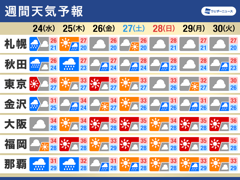 東日本や西日本は、夏の太平洋高気圧に覆われて広範囲で夏空となる見込みです。強い日差しや暖かい空気の流れ込み、フェーン現象も加わり、多くの地域で気温が30℃を超える真夏日が続く予想です。特に大阪や福岡などでは、35℃以上の猛暑日が続くとみています。