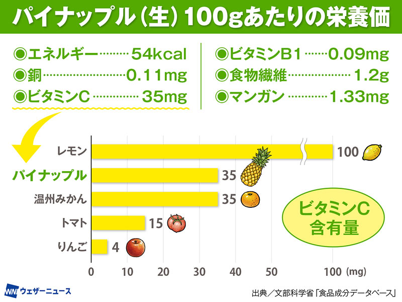 「パイナップルには、抗酸化作用や肌の調子を整えるとされるビタミンC、糖質のエネルギー代謝に必要なビタミンB1が多く含まれています。また、身体で働く酵素の主成分になるマンガン、鉄から赤血球を作る働きがある銅などのミネラル類も豊富です。
