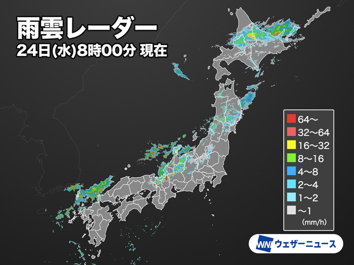 今日24日(水)は梅雨前線や暖かく湿った空気の影響で朝から雨の強まっている地域があります。