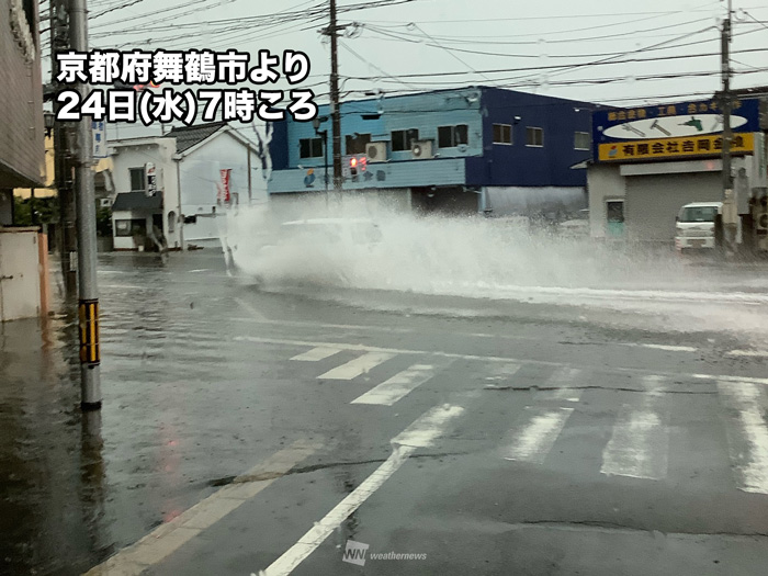 8時00分までの1時間に滋賀県長浜市のアメダス柳ケ瀬では37.5mmの激しい雨を観測。京都府舞鶴市では道路冠水発生して、車が水しぶきを上げている様子が見られました。また、福井県や岐阜県などでも雨が強まっています。