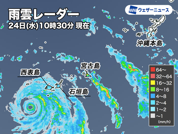 台風本体の活発な雨雲が沖縄の先島諸島に流れ込み、沖縄本島や奄美大島にも台風の外側の発達した雨雲が流れ込んでいます。10時時点では1時間に10mm前後のやや強い雨ですが、午後にかけて暴風に乗って横殴りの雨が強弱を繰り返して降り続きます。