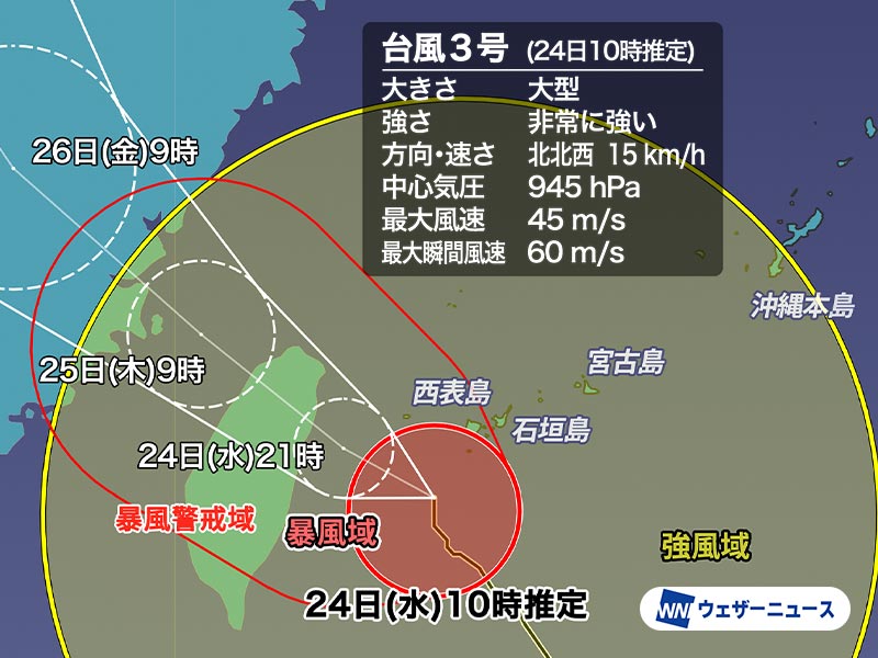7月24日(水)10時には、大型で非常に強い勢力の台風3号(ケーミー)は西表島の南南西の海上を北北西に進んでいます。
