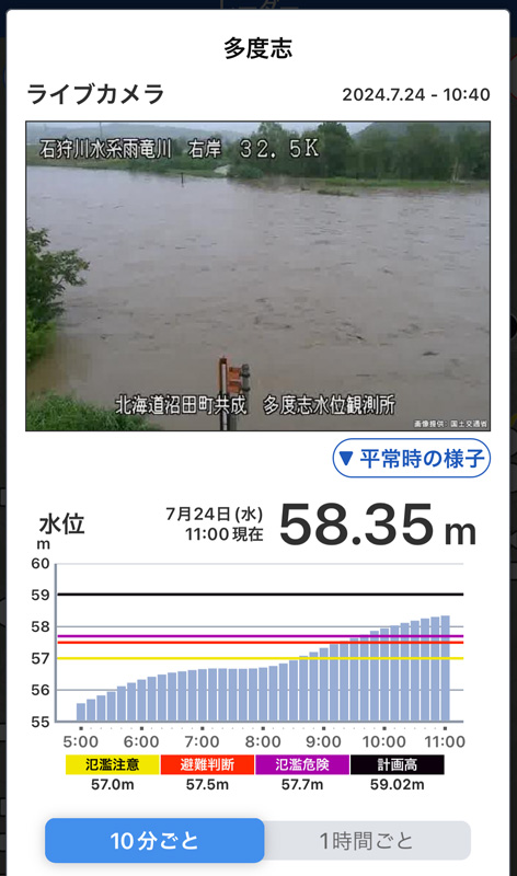 氾濫が発生したのは、深川市多度志付近(左岸)で、周辺の低地では浸水被害が発生するおそれがあります。まだ周囲が浸水してなければただちに低地から離れ、もし既に浸水が始まっていたらなるべく上の階で安全を確保するようにしてください。