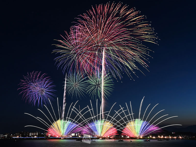 巻の「正三尺玉」が一晩に3発と、迫力満点の花火大会です。直径650mのまばゆい光が夜空に炸裂し、その轟音は体の芯をも揺るがすほど。今年のテーマは「輝」となっており、趣向が凝らされた演出にも注目です。