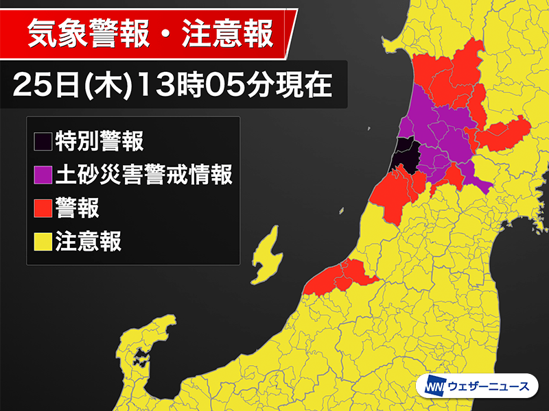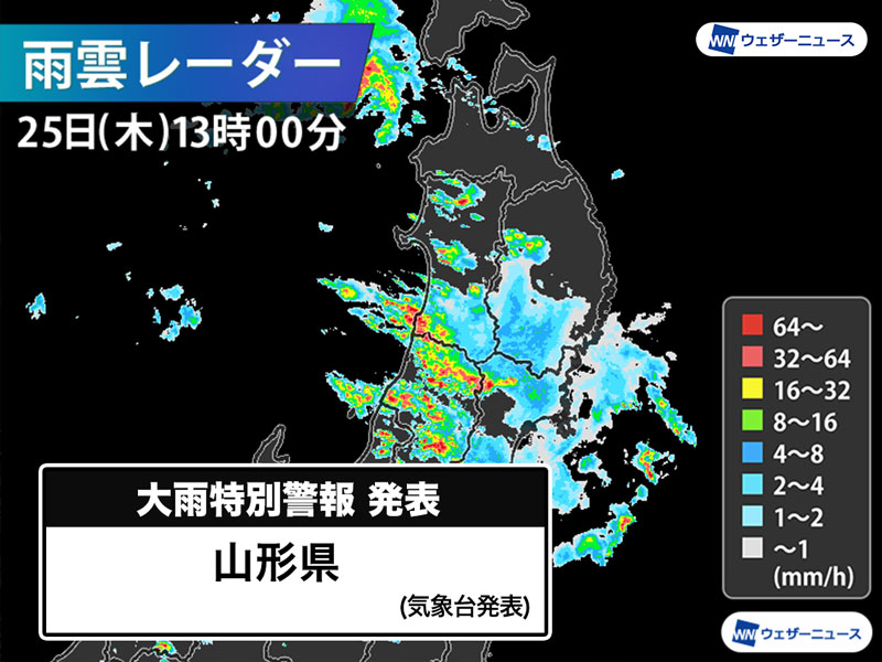 25日(木)13時、山形県に大雨特別警報が発表されました。