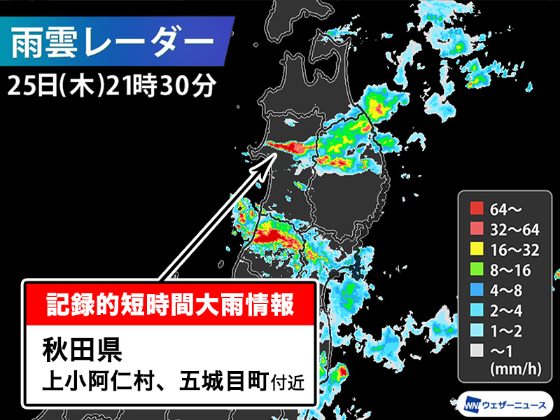 秋田県で1時間に約120mmの猛烈な雨 記録的短時間大雨情報