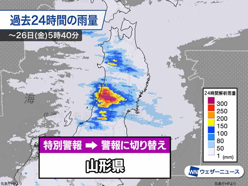 山形県内は記録的な大雨となり、24時間降水量は新庄で388.0mmに達して、400mm近い雨を観測しています。土砂災害の危険度は依然として高くなっているところが多く、警戒レベル5の「緊急安全確保」が発令されている自治体があります。
