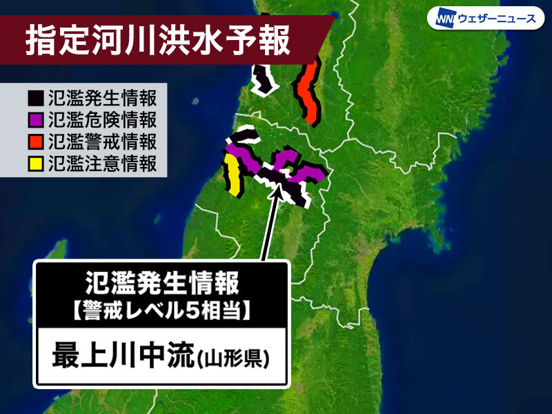 記録的な大雨の影響で、山形県を流れる最上川(もがみがわ)が増水し、氾濫が発生したとして、新庄河川事務所 山形地方気象台は氾濫発生情報【警戒レベル5相当】を発表しました。