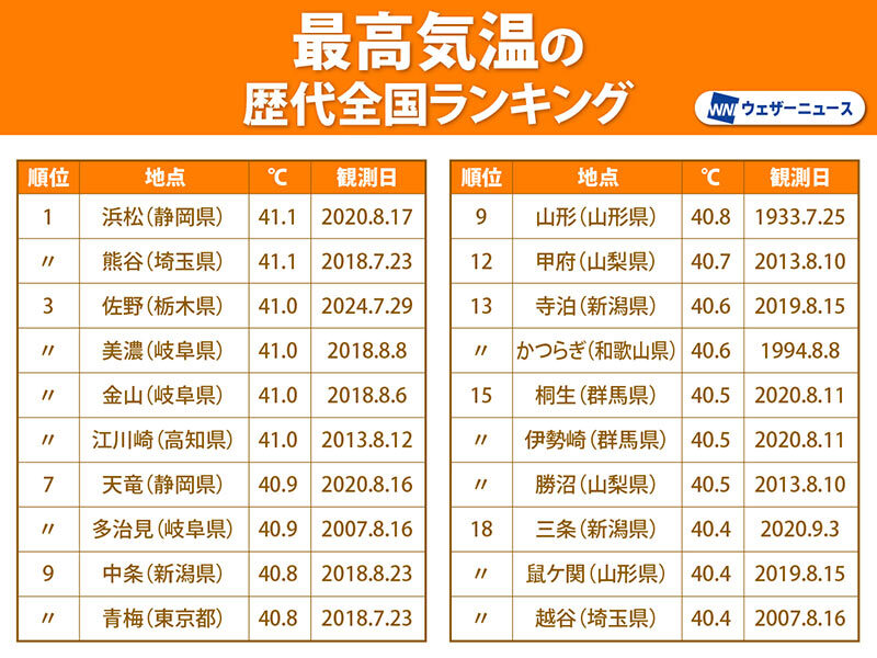 気象庁が発表している最高気温の歴代全国ランキングを見ると、20位以内である40.4℃以上を記録したのは20回あることがわかります。