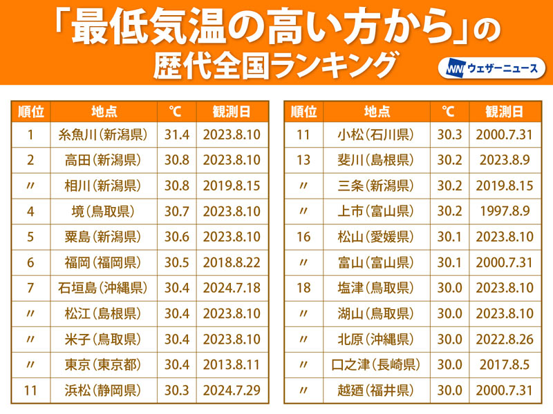 最低気温が最も高かったのは、去年(2023年)の8月10日に新潟県糸魚川市で記録された31.4℃です。夕方から翌日の朝までの最低気温が25℃以上の夜を熱帯夜といいます。その熱帯夜の基準である25℃を6℃以上も上回っています。