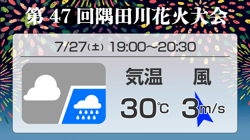 また、日が沈んでいるとはいえ開催時間帯の気温は30℃前後の予報で、人混みを動き回るといつも以上に暑く感じそうです。トイレ事情などで水分を控えようと考える方もいらっしゃるかと思いますが、熱中症にはご注意ください。