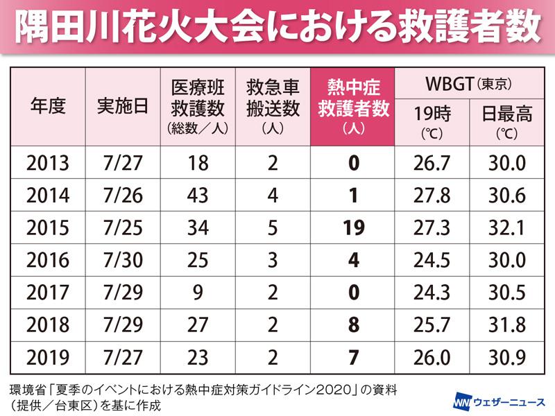 花火大会は暑さも忘れる楽しいイベントですが、体調を崩すリスクがあります。例えば、約95万人が集まる隅田川花火大会(東京都墨田区)では、毎年9〜43名の救護者が発生し、うち熱中症患者は多い年で19名。ほぼ毎年熱中症患者が発生しているのです。