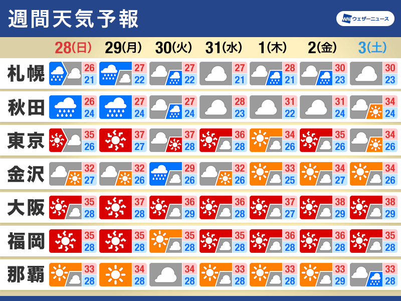 東日本や西日本では、強い日差しや暖かい空気に覆われることにより、都市部含め多くの地域で気温が35℃前後の日が続く予想です。