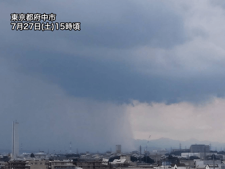 東京都の多摩西部で雨雲の発達が目立ち、少し離れた府中市からも雨柱がみられました。この雨雲が通過したとみられる奥多摩町・小河内ではピーク時に10分間で7.5mm(1時間に換算すると40mm超)の雨を観測しています。
