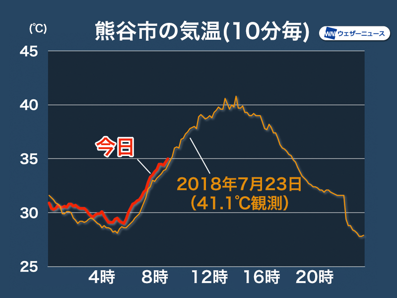 全国歴代最高気温の41.1℃を記録した2018年7月23日の10分毎の気温に比べても、今日はわずかではありますが高めで推移しているほどです。わずかな風の条件の違いなどでこの後の気温は変化してくるものの、近い水準まで上昇する可能性は十分にあると考えられます。