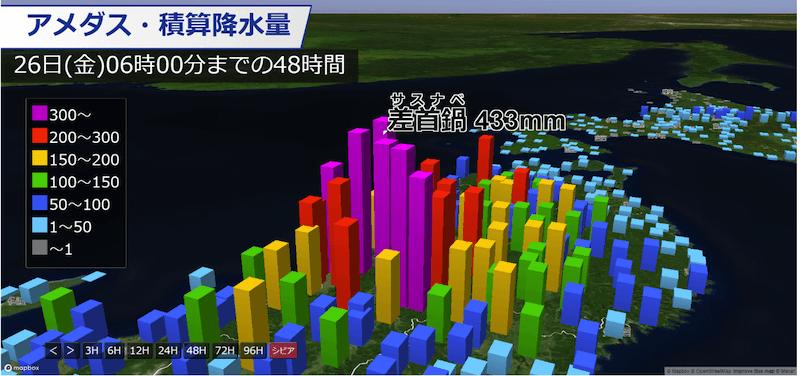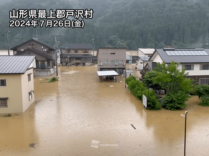 山形県のアメダス差首鍋(サスナベ)では26日6時までの48時間降水量が433mm、山形県のアメダス新庄(シンジョウ)では48時間降水量が402mmに達しました。平年の7月1ヶ月分の雨量は200mmほどで、それを大きく上回る降雨となりました。