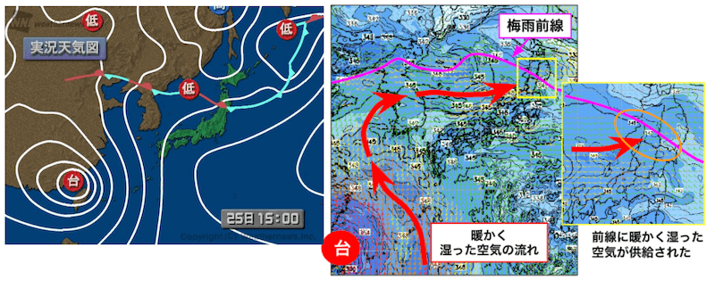 東北地方には紫線で示される梅雨前線が存在していて、近傍では右肩下がりに延びています。台風由来の暖かく湿った空気がちょうど前線に衝突する方向となっていて、この影響で前線近傍での雨雲の発生に関わる対流活動が非常に活発になったと考えられます。