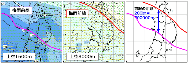 この図は上空およそ1,500mと3,000mにおいて、風向の変化を元に梅雨前線の概ねの位置を描画したものです(MSM25日9時初期値)。前線は通常、上空にいくほど北に位置する形になっています。雨雲を発生させるには上昇流が必要で前線の傾きが急であるほど、強い上昇流が発生しやすいと言えます。