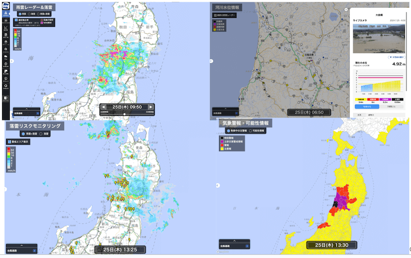 上記はコンテンツの一部ですが、線状降水帯の解析、河川の水位の様子、落雷の位置、特別警報、警報、注意報の発表の様子などを確認いただけます。