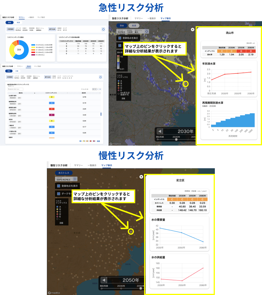 洪水や高潮のように、ひとたび発生すると大きな被害につながるような"急性リスク"や、水不足のように徐々に損害につながる"慢性リスク"を定量的に分析が可能です。