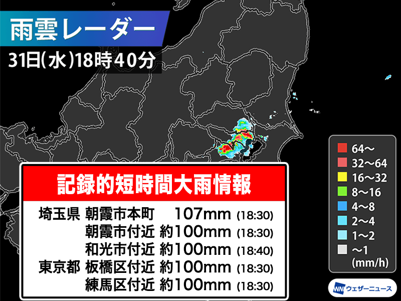 東京都内で1時間に100mm以上の猛烈な雨 記録的短時間大雨情報