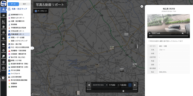 また、ウェザーニュースアプリを利用するユーザーからの報告を「天気&体感リポート」画面内に表示、どこで強く降っているのかを見える化しています。ゲリラ豪雨をもたらす雨雲は、アメダスの観測網に対して小さく、観測網をすり抜けてしまうことが多々あります。現地にいるアプリユーザーからの報告で強い雨の場所を把握することにより、お客様の拠点周辺のリスクをより正確に把握することが可能となります。