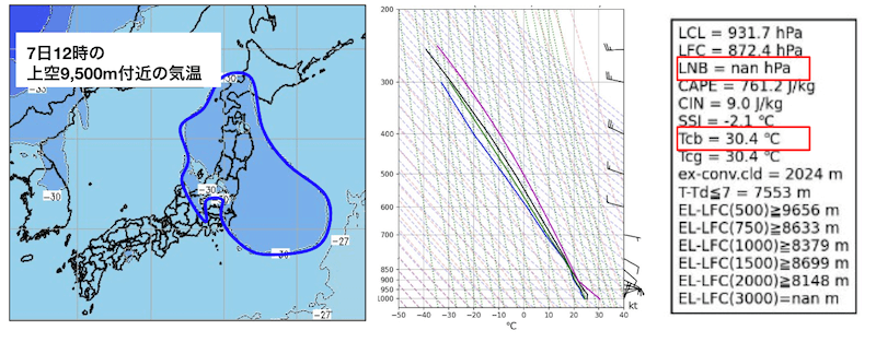 (左)7日12時の上空約9,500m付近の気温(MSM12時の初期値) (右)熊谷の大気の様子(7日21時)
