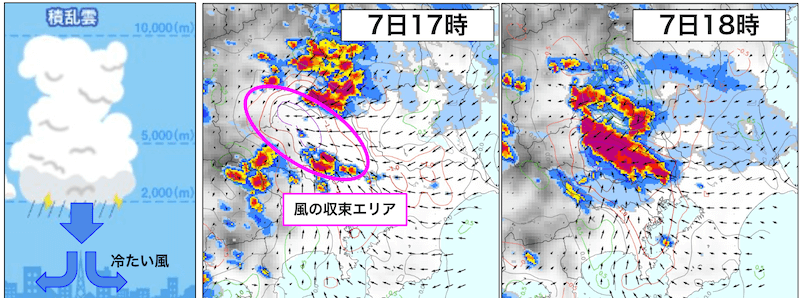 右の図は7日17時および18時における雨雲と風の様子を示しています。17時時点では栃木県方面に活発な雲が存在していて、この雲から南西方向に風が吹き出していました。これにより、埼玉県から東京都方面で風が集まりました。その1時間後の18時には、風が収束していたところで新たに発達した雲が発生しているのがわかります。