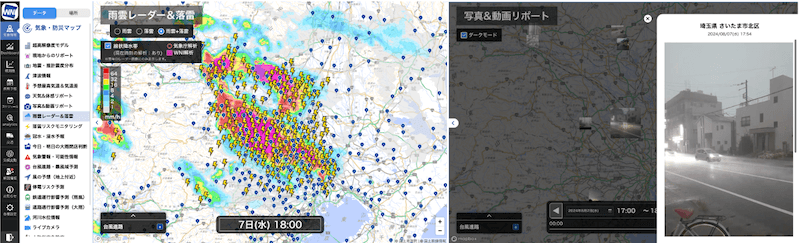 (左)雨雲レーダー&落雷 (右)写真&動画レポート