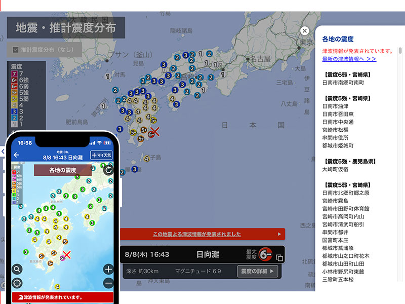 8月8日(木)16時43分頃、日向灘を震源とするマグニチュード7.1、深さ約30kmと推定される地震が発生しました。この地震で宮崎県日南市で最大震度6弱、宮崎市、串間市、都城市、大崎町で震度5強が観測されました。
