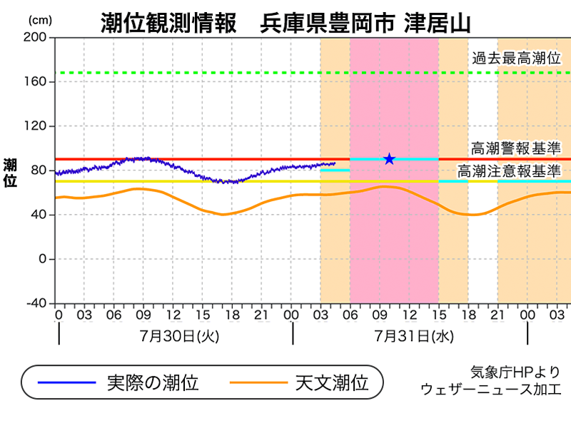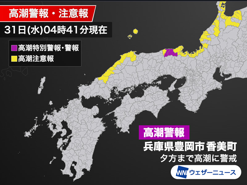 高潮警報の出ている兵庫県豊岡市や香美町では、夕方にかけて潮位が高潮警報基準近くに高まる予想です。海岸や河口付近の低い土地で浸水や冠水に注意・警戒が必要です。