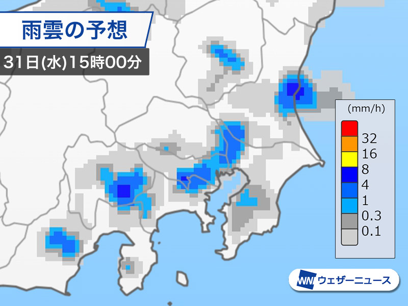 今日31日(水)は関東各地で晴れていますが、気温の上昇とともに昼頃からは雨雲が発達しやすくなります。午後は関東各地で天気の急変するおそれがあります。