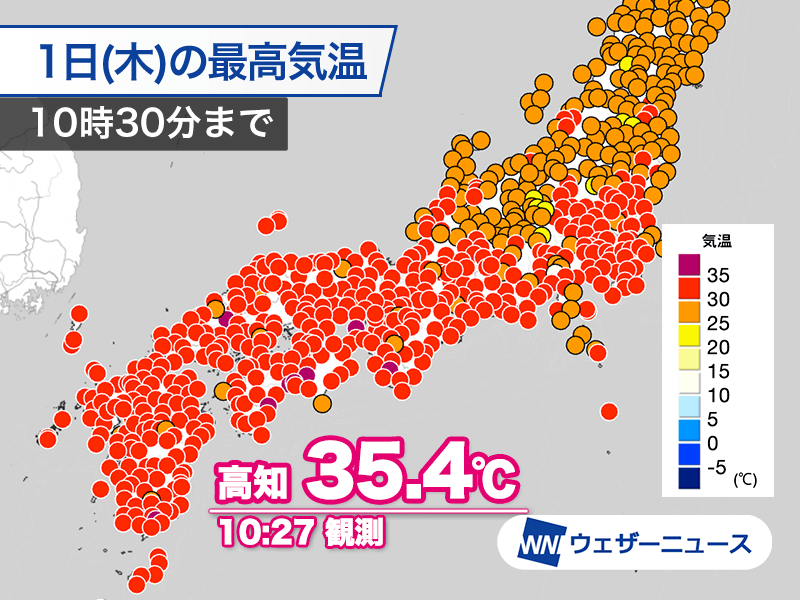 今日8月1日(木)は日本列島の上空を覆う高気圧の中心が東シナ海方面にあり、西日本や東海で特に厳しい暑さとなっています。高知市では10時30分までに35℃以上の猛暑日となり、西日本の太平洋側で特に気温が高い状況です。福岡や大阪、名古屋でも33℃くらいまで上がり、午前中から厳しい暑さになっています。