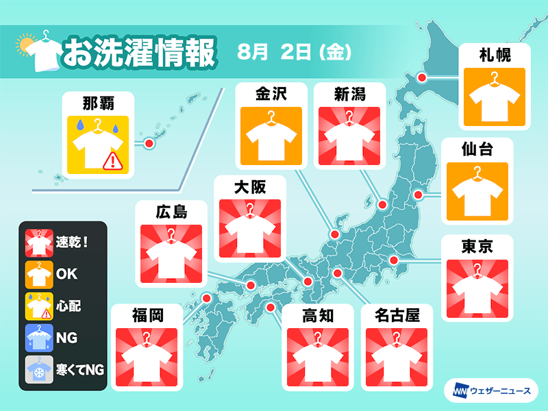 東日本や西日本は晴れて外干し日和となりそうです。陰干しが指定されている衣類も、気温が高いため短い時間で乾かすことができそうです。ただ、全く雨の心配がないわけではなく、山沿いなどでは小さな雨雲が発生する可能性があります。上空を通過すれば本降りになってしまうため、心配な場合は早めに取り込んでおくのが良さそうです。