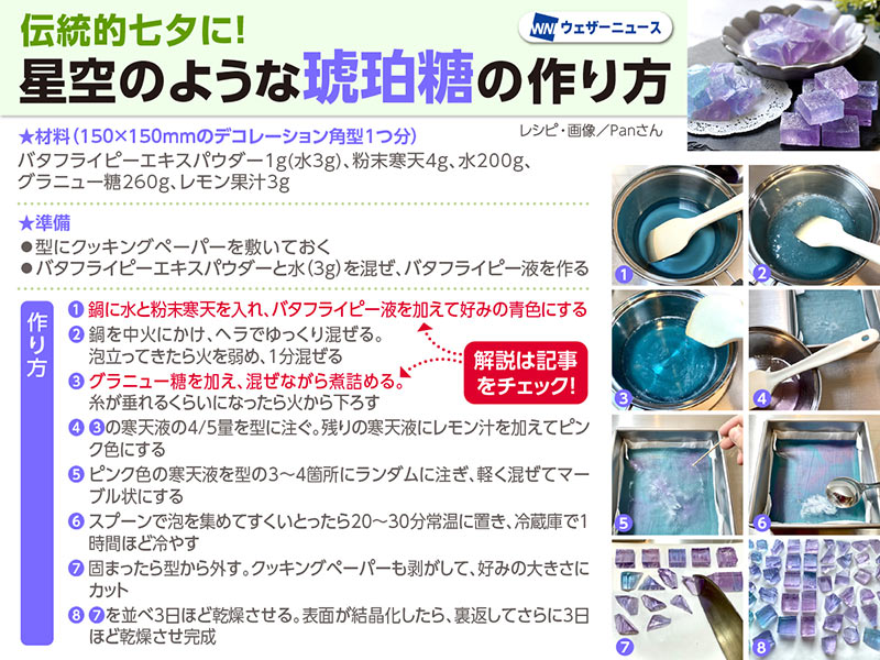 七夕をより楽しむのにおすすめしたいスイーツが、「バタフライピーの琥珀糖」。パティシエで富澤商店レシピクリエイターとしても活躍するPanさんのレシピです。