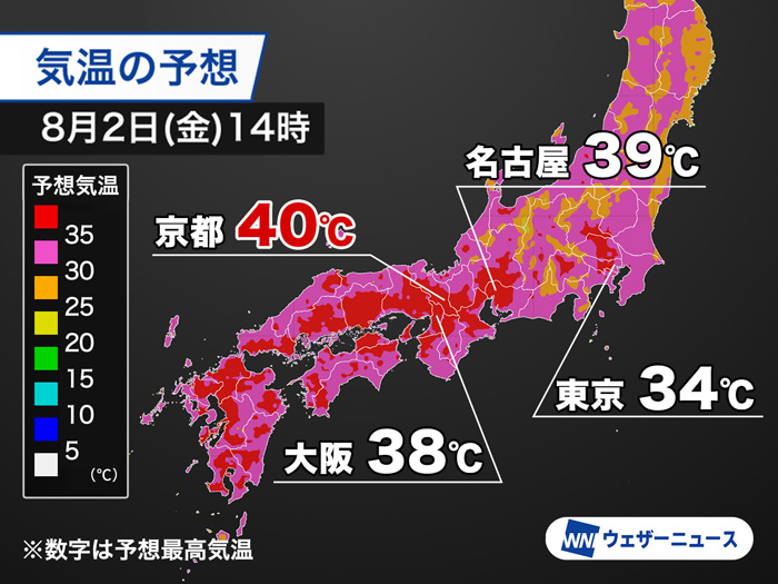 西日本ではすでに35℃を超えている所があり、午後は40℃に迫る猛烈な暑さとなる見通しです。最高気温は京都市で40℃、名古屋市で39℃、大阪市で38℃を予想しています。